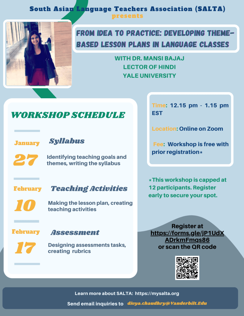 The 2023 Hindi and Urdu Teacher Training Institute is conducted online and it is designed to enhance the knowledge and skills of school, community and college teachers of Hindi and Urdu. The program is the result of a partnership between and is funded by It is funded by the Hagop Kevorkian Center, New York University, South Asian Institute, the University of Texas at Austin, the Asian Studies Center, and Michigan State University. The program awards a completion certificate for 50 hours to all participants who successfully completed the coursework.